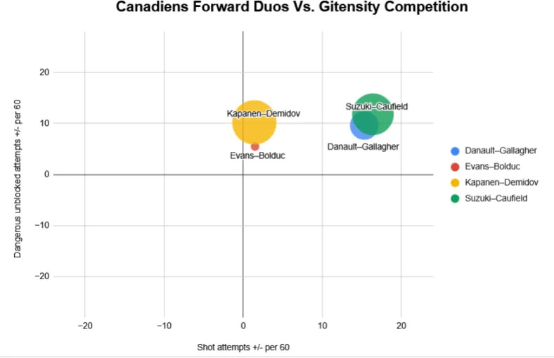 As the charts show, the Evans–Bolduc duo is on the positive side of dangerous unblocked attempts regardless of whether they play against the elite, middle, or ‘gritensity‘ competition. While they aren’t able to control the overall shooting against the absolute top players like Suzuki and Caufield, they still manage to control the chances at an almost same rate.