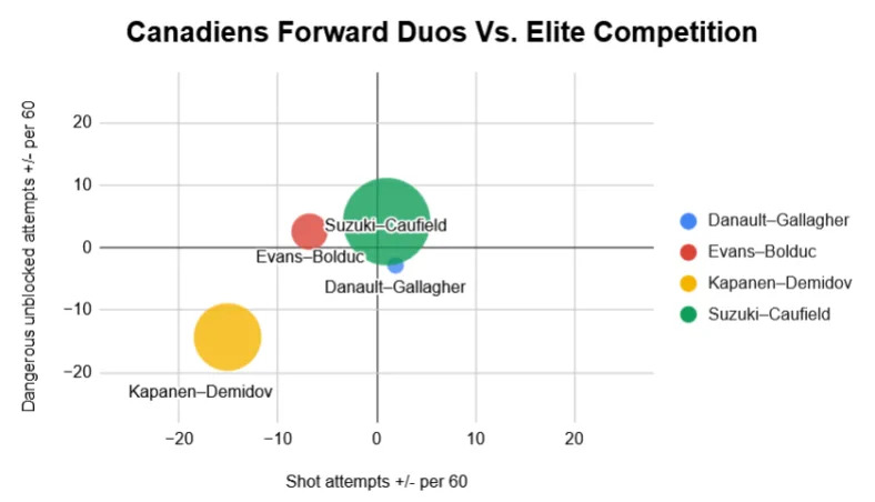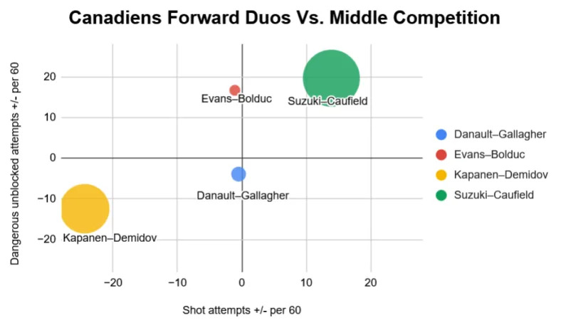 That’s of course partially because of the Suzuki–Caufield duo has been deployed against the other teams’ top players, but it’s worth noting that the quality of competition data from PuckIQ shows that Evans and Bolduc have faced as hard, if not harder, matchups as Kapanen and Demidov. And they’ve done it with a defensive zone heavy zone start deployment.