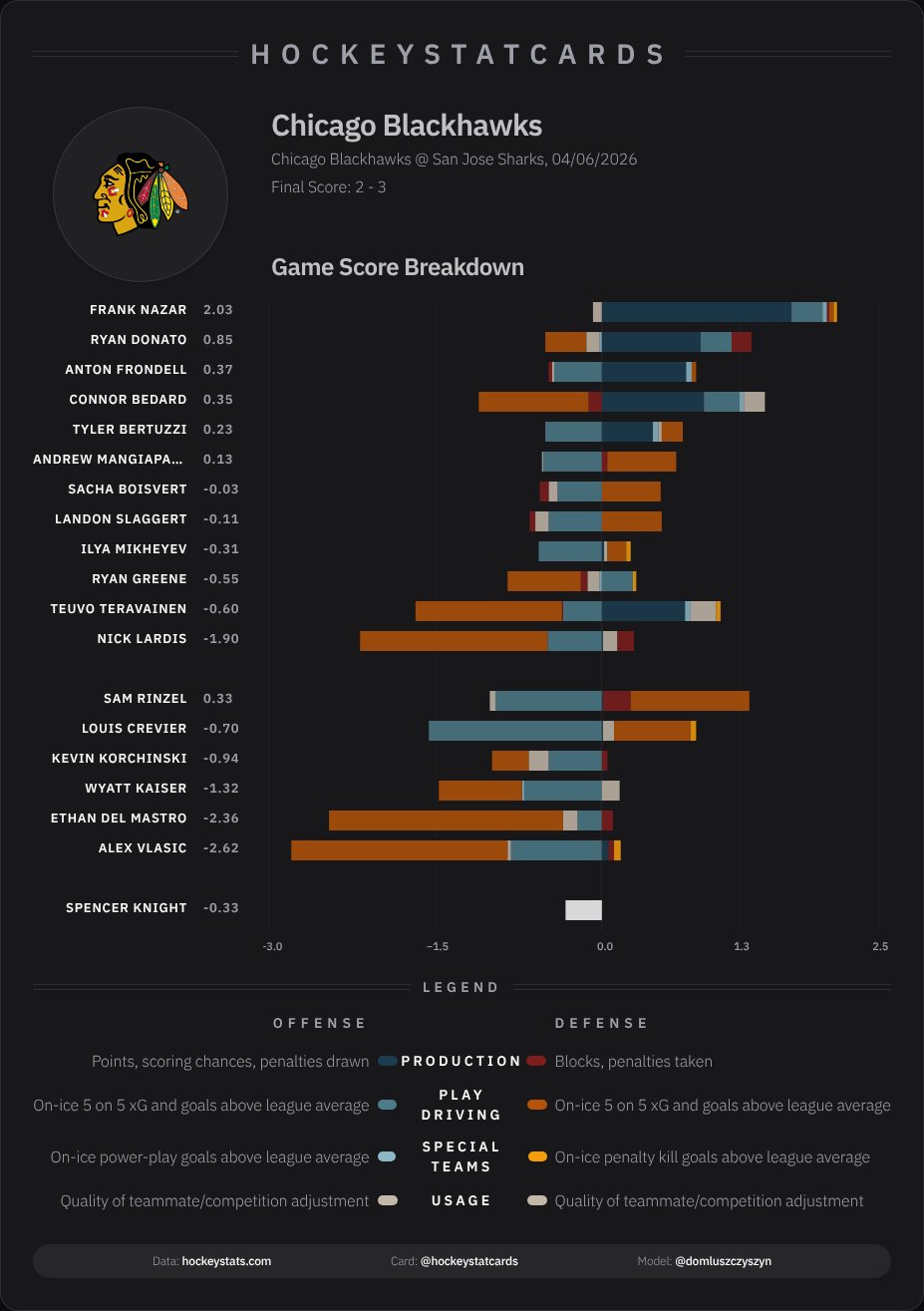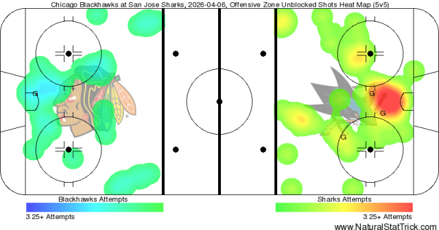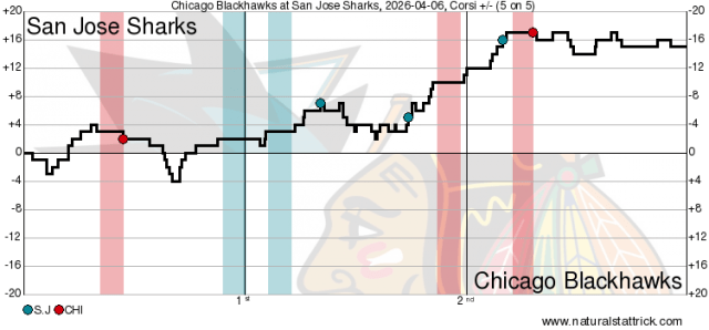 If there’s a general theme from this game, it’s that the Hawks didn’t do enough at 5-on-5 to earn the win. Chicago did end with a 29-23 advantage in shots on goal overall, but was outshot 20-16 during the 48:53 in 5-on-5 play during this game. San Jose also had the advantage in shot attempts (44-20) and scoring chances (20-11) and high-danger chances (12-5), resulting in an expected goal share of 56.91 percent for the home side. Not a huge number, but enough to make the difference in this game.