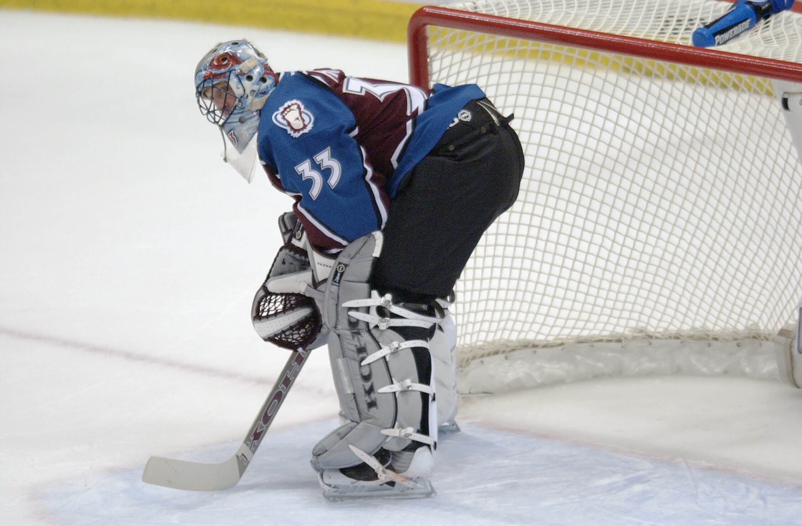 Patrick Roy during Game 7 of the 2002 Western Conference final. (Elsa / Getty Images / NHLI)