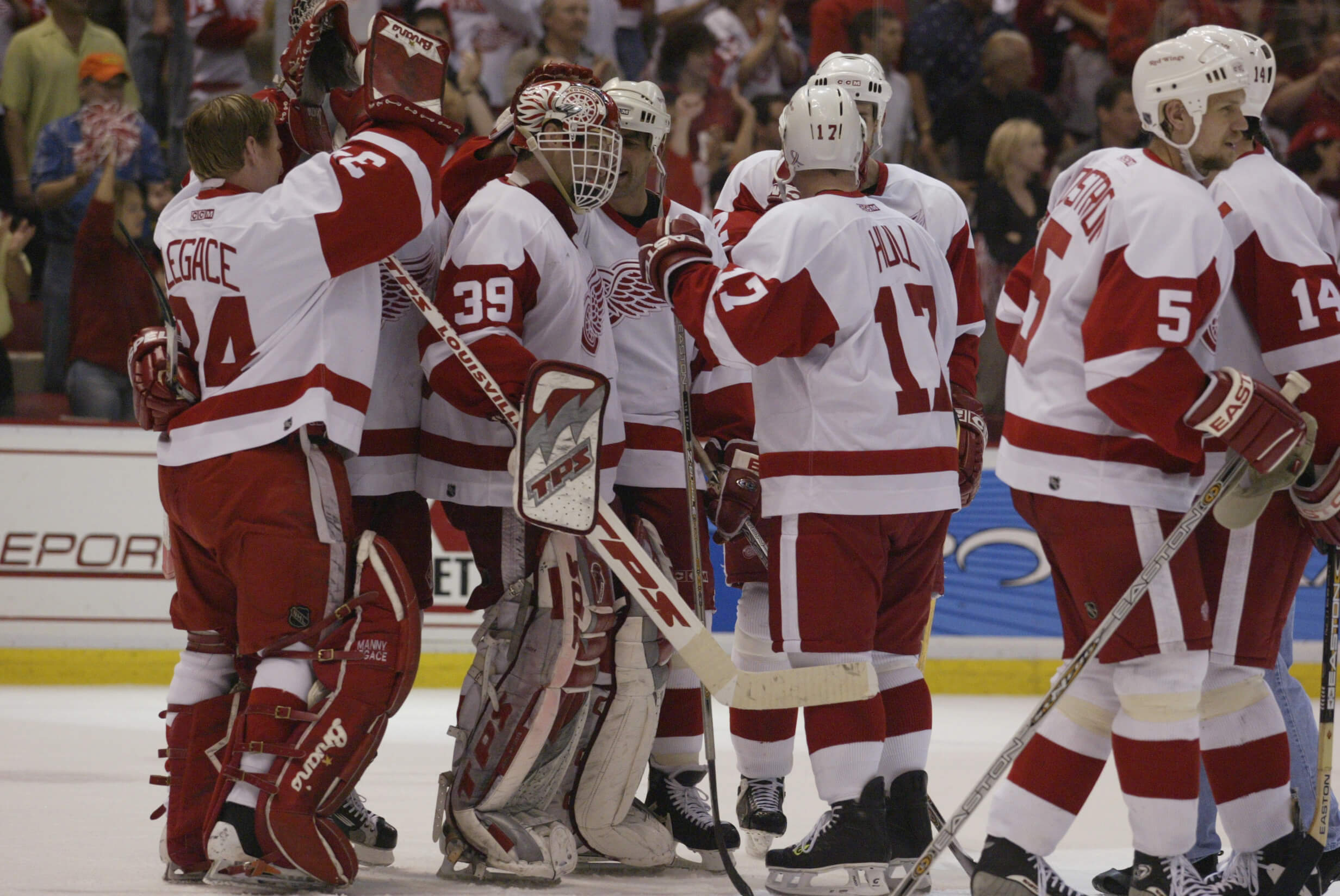 The Detroit Red Wings celebrate with goaltender Dominik Hasek after their victory over the Colorado Avalanche in Game 7 of the 2002 Western Conference final. (Tom Pidgeon / Getty Images / NHLI)