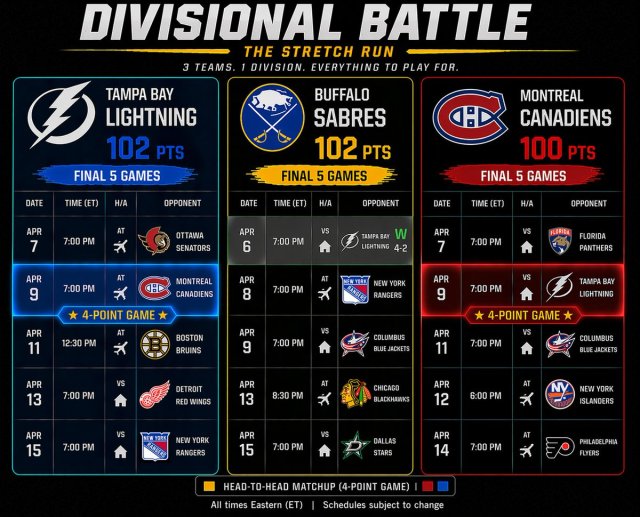 As the regular season is rounding out to a close, the games are ramping up in intensity as well. The Buffalo Sabres had a huge regulation win over Tampa on Monday night, and with Montreal right in the mix for the division lead, it’s going to stay pretty tense. This is the situation as of Tuesday morning.