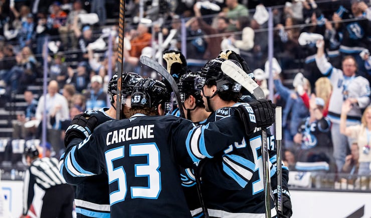 Utah Mammoth players celebrate around defenseman Sean Durzi (50) after he scored a goal to tie the game against the Edmonton Oilers 5-5 during the third period of an NHL game held at the Delta Center in Salt Lake City on Tuesday, April 7, 2026. | Isaac Hale, Deseret News