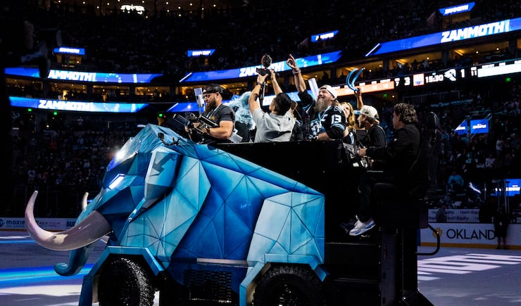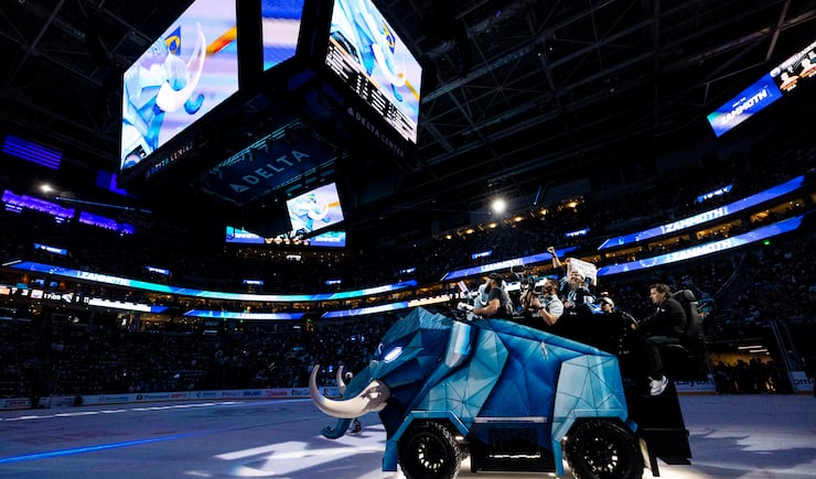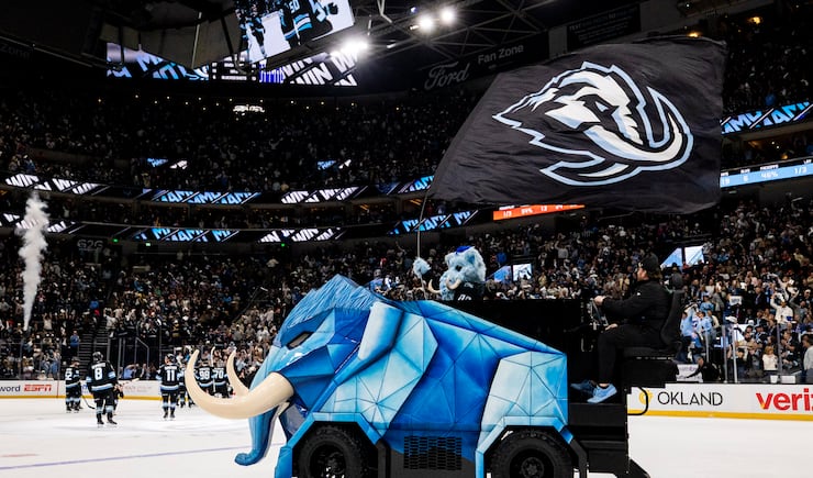 Tusky waves a Mammoth flag atop the Zammoth, a Mammoth-themed Zamboni for fans, after the Mammoth defeated the Edmonton Oilers 6-5 in overtime of an NHL game held at the Delta Center in Salt Lake City on Tuesday, April 7, 2026. | Isaac Hale, Deseret News