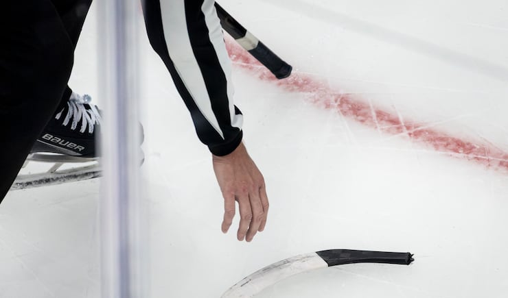 A referee picks up a piece of a broken stick during the third period of an NHL game between the Utah Mammoth and the Edmonton Oilers held at the Delta Center in Salt Lake City on Tuesday, April 7, 2026. | Isaac Hale, Deseret News