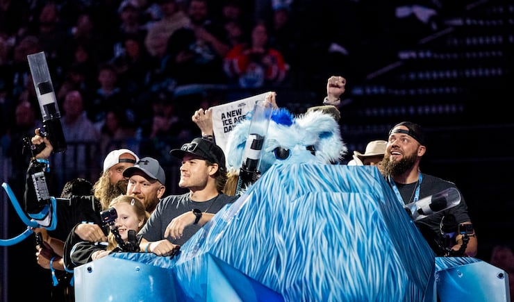 Fans cheer atop the Zammoth, a Mammoth-themed Zamboni for fans, as it is unveiled between the first and second periods of an NHL game between the Utah Mammoth and the Edmonton Oilers held at the Delta Center in Salt Lake City on Tuesday, April 7, 2026. | Isaac Hale, Deseret News