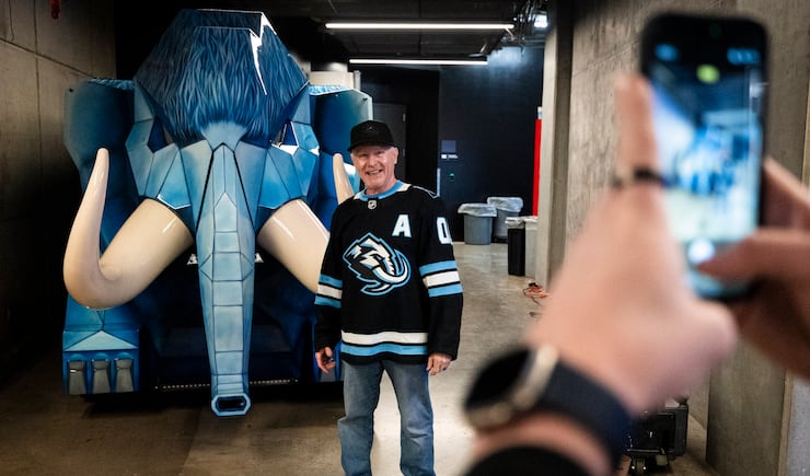 John Ruskauff, of North Salt Lake, poses for a photo with the Zammoth, a Mammoth-themed Zamboni for fans, during the second period of an NHL game held at the Delta Center in Salt Lake City on Tuesday, April 7, 2026. | Isaac Hale, Deseret News