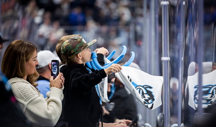 Young Utah Mammoth fans cheer during the third period of an NHL game against the Edmonton Oilers held at the Delta Center in Salt Lake City on Tuesday, April 7, 2026. | Isaac Hale, Deseret News