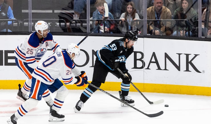 Utah Mammoth left wing Michael Carcone (53) controls the puck as he is pursued by Edmonton Oilers center Curtis Lazar (20) and defenseman Darnell Nurse (25) during the third period of an NHL game held at the Delta Center in Salt Lake City on Tuesday, April 7, 2026. | Isaac Hale, Deseret News