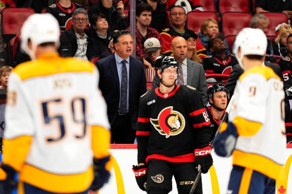 Ottawa Senators Head Coach Travis Green speaks with an official from the bench during first period NHL hockey action in Ottawa, on Monday, Oct. 13, 2025. THE CANADIAN PRESS/Justin Tang