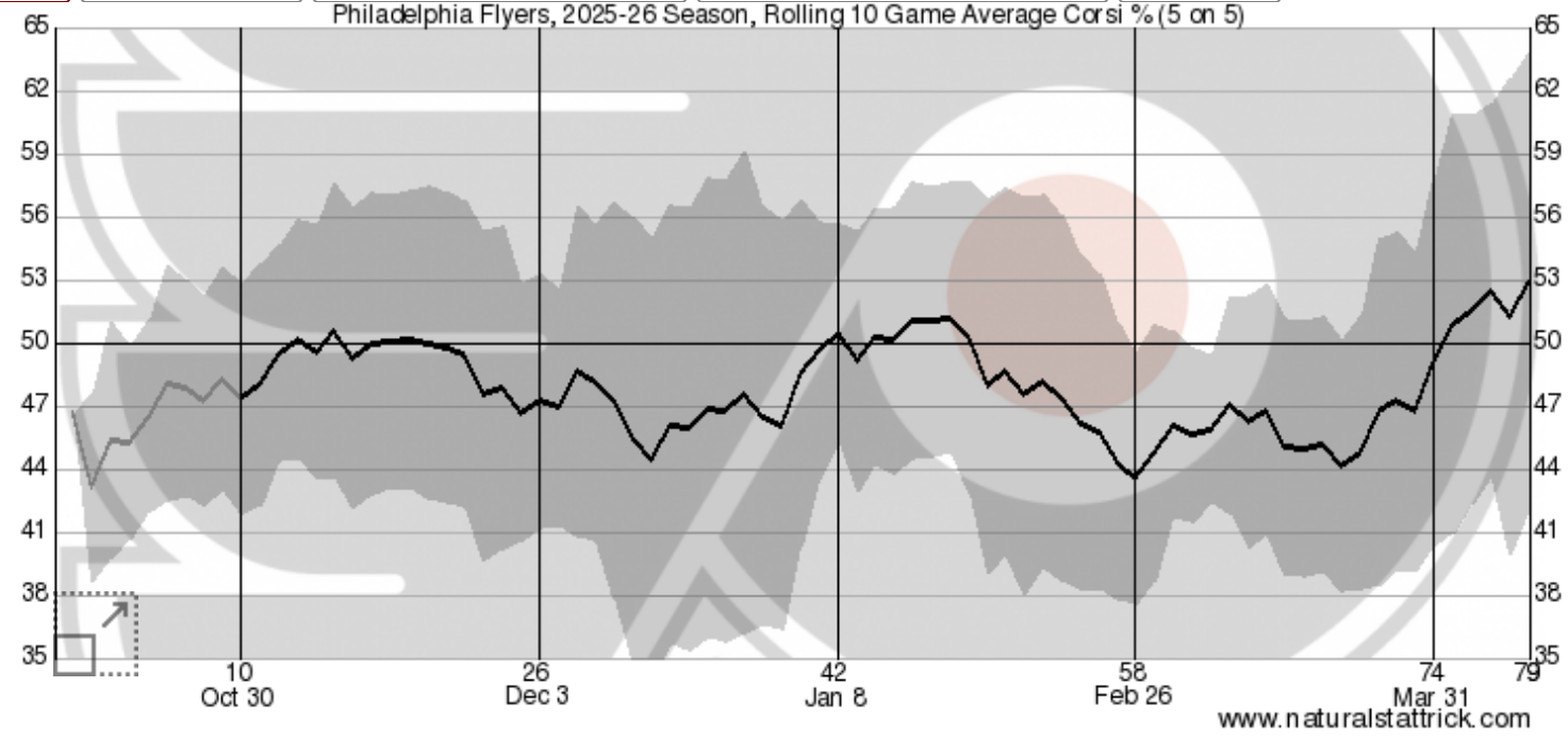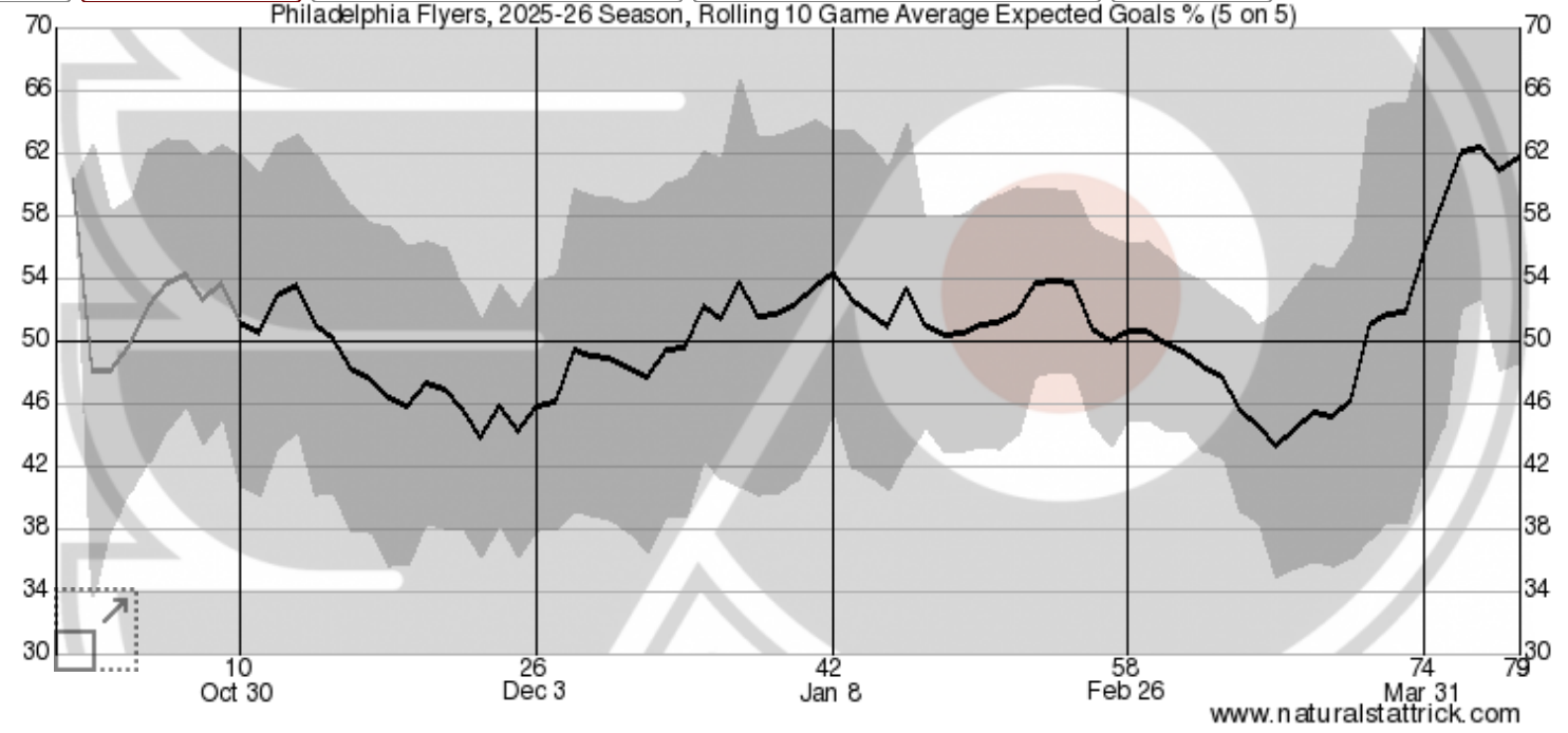 According to NaturalStatTrick, the Flyers possession numbers have climbed significantly over the past month, and in turn, so has their expected goals at 5-on-5.Â