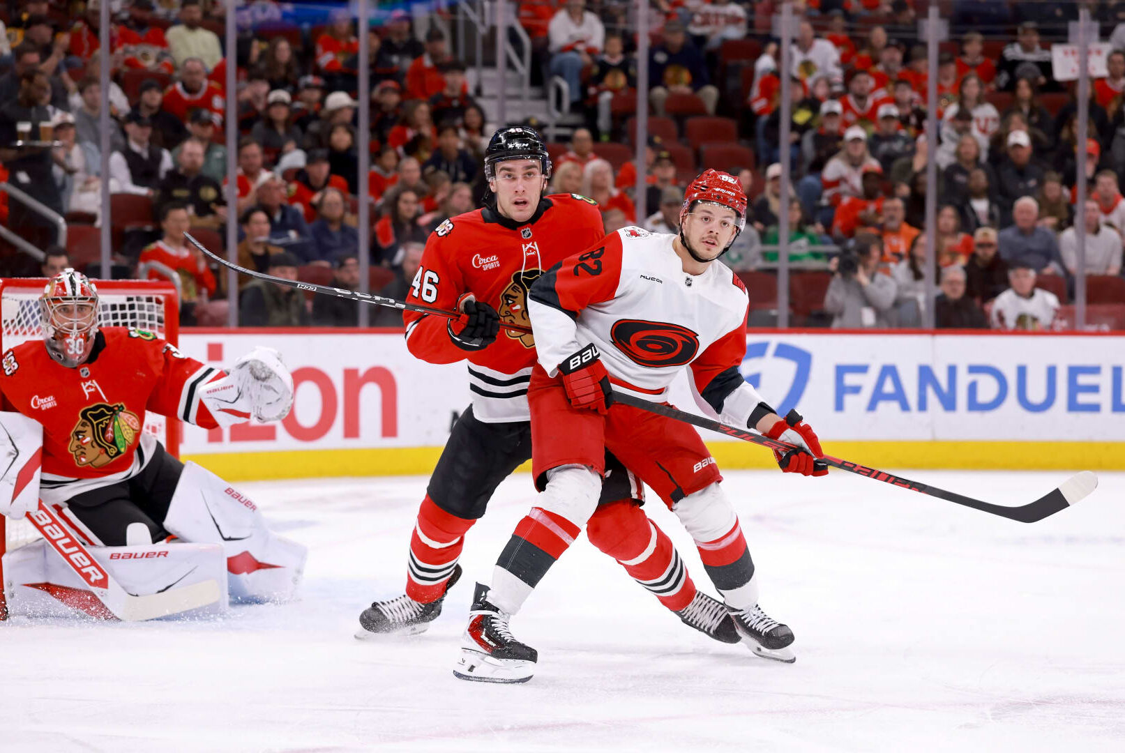 Louis Crevier defends Jesperi Kotkaniemi in front of the net during the Chicago Blackhawks’ 7-2 loss to the Carolina Hurricanes on Thursday night. (Photo courtesy of the Chicago Blackhawks)