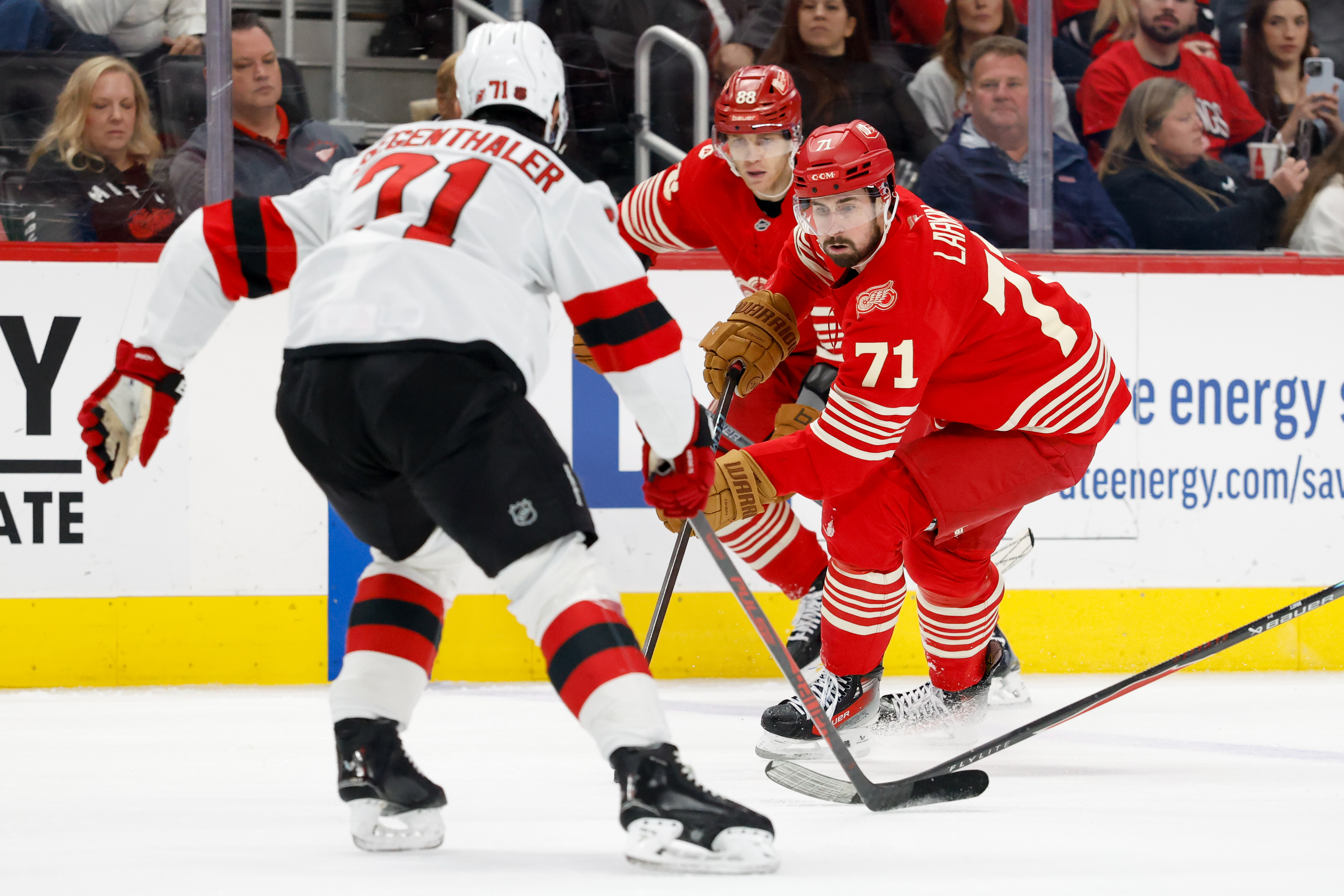Detroit Red Wings center Dylan Larkin (71) skates with the puck against the New Jersey Devils at Little Caesars Arena. Mandatory Credit: Rick Osentoski-Imagn Images