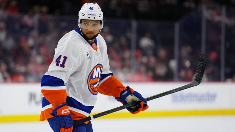The Islanders’ Marshall Warren, from Laurel Hollow, takes his rookie lap in Philadelphia for his NHL debut on Oct. 25, 2025.