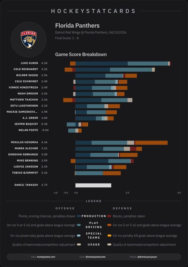 The Florida Panthers closed out the 2025-26 campaign by routing the Detroit Red WIngs by an 8-1 count in front of an appreciative crowd at Amerant Bank Arena.