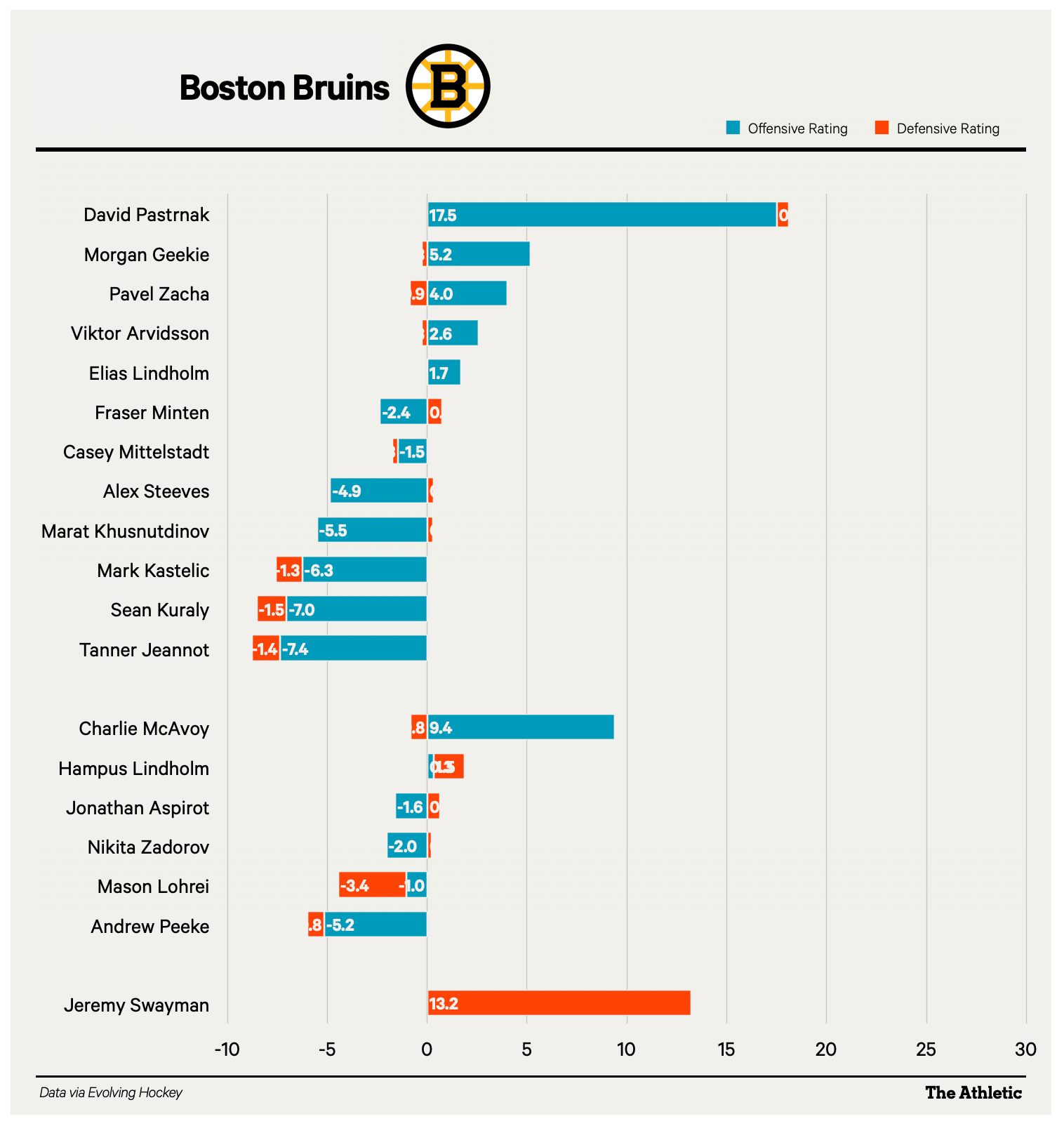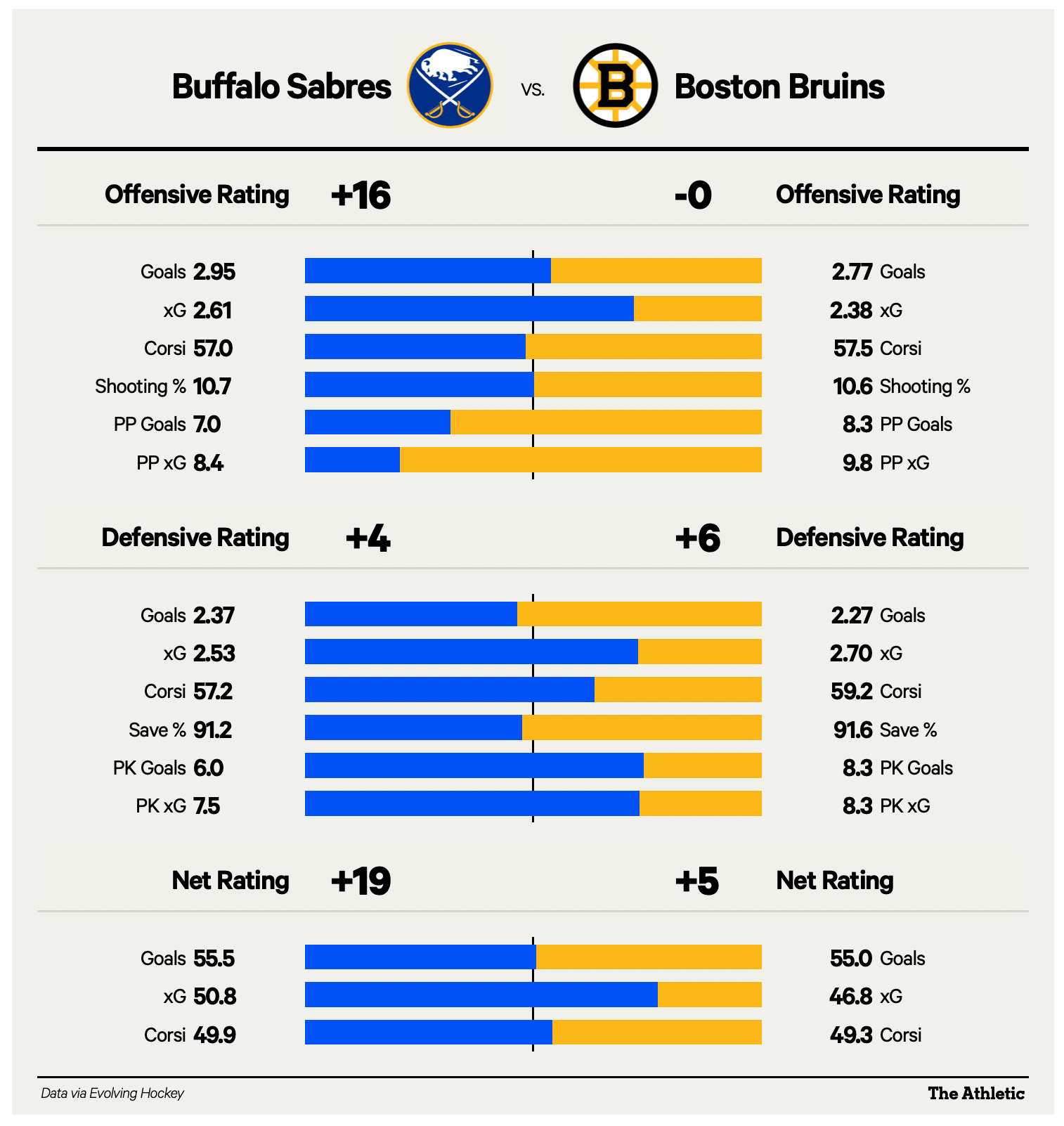 The plus-14 gap in Net Rating between the Bruins and Sabres primarily stems from differences in offensive strengths.