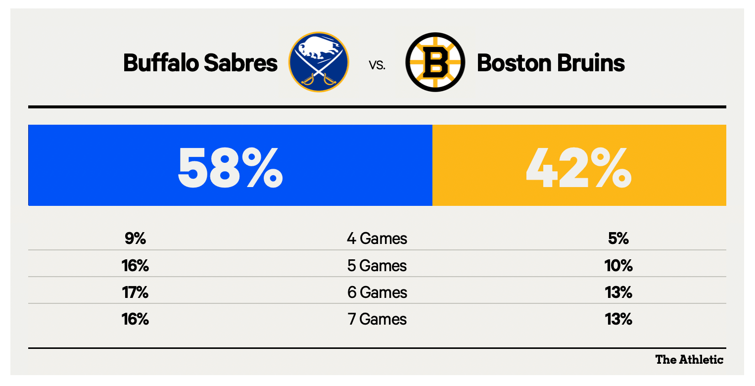 While the model is skeptical of that, despite being one of Buffalo’s biggest champions to start the season, it does see the Sabres as favorites to advance past the Bruins. Getting to play arguably one of the weakest playoff teams to start will have that effect.