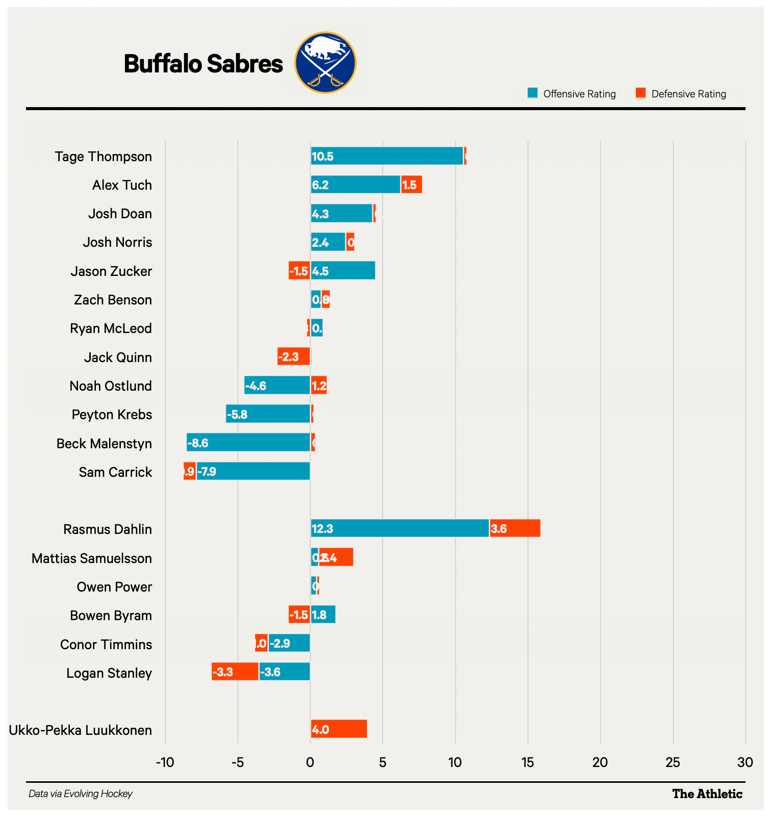 Josh Doan is a beast on the forecheck (plus-6.7 Net Rating this season), Zach Benson is a shifty two-way ace (plus-6.0 Net Rating), Noah Ostlund is already turning heads defensively (plus-2.9 Defensive Rating), and Jack Quinn is realizing his offensive potential (plus-2.8 Offensive Rating). It’s all coming together in real time and that group is supported well by a strong cast of veterans — Alex Tuch, Josh Norris, Jason Zucker, Ryan McLeod — that brings everything together. It just fits.