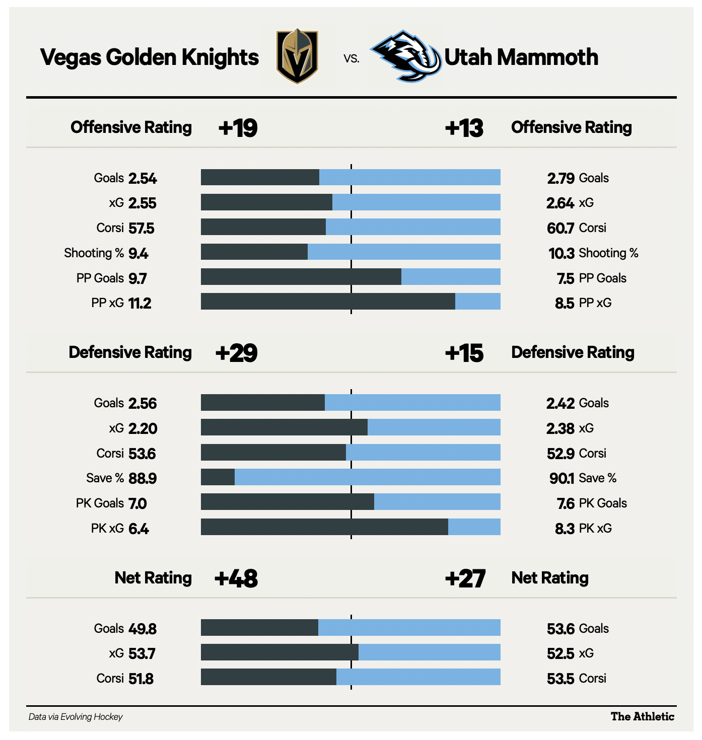 There are levels to this that often get exposed in the postseason, a lesson that Vegas has applied ruthlessly to its team-building philosophy since a lightning-in-a-bottle first-year run to the Cup final. On paper, Vegas’ group has Utah’s beat in each role. Total value: a projected Net Rating of plus-65 to Utah’s plus-39. That’s the main difference in this series.