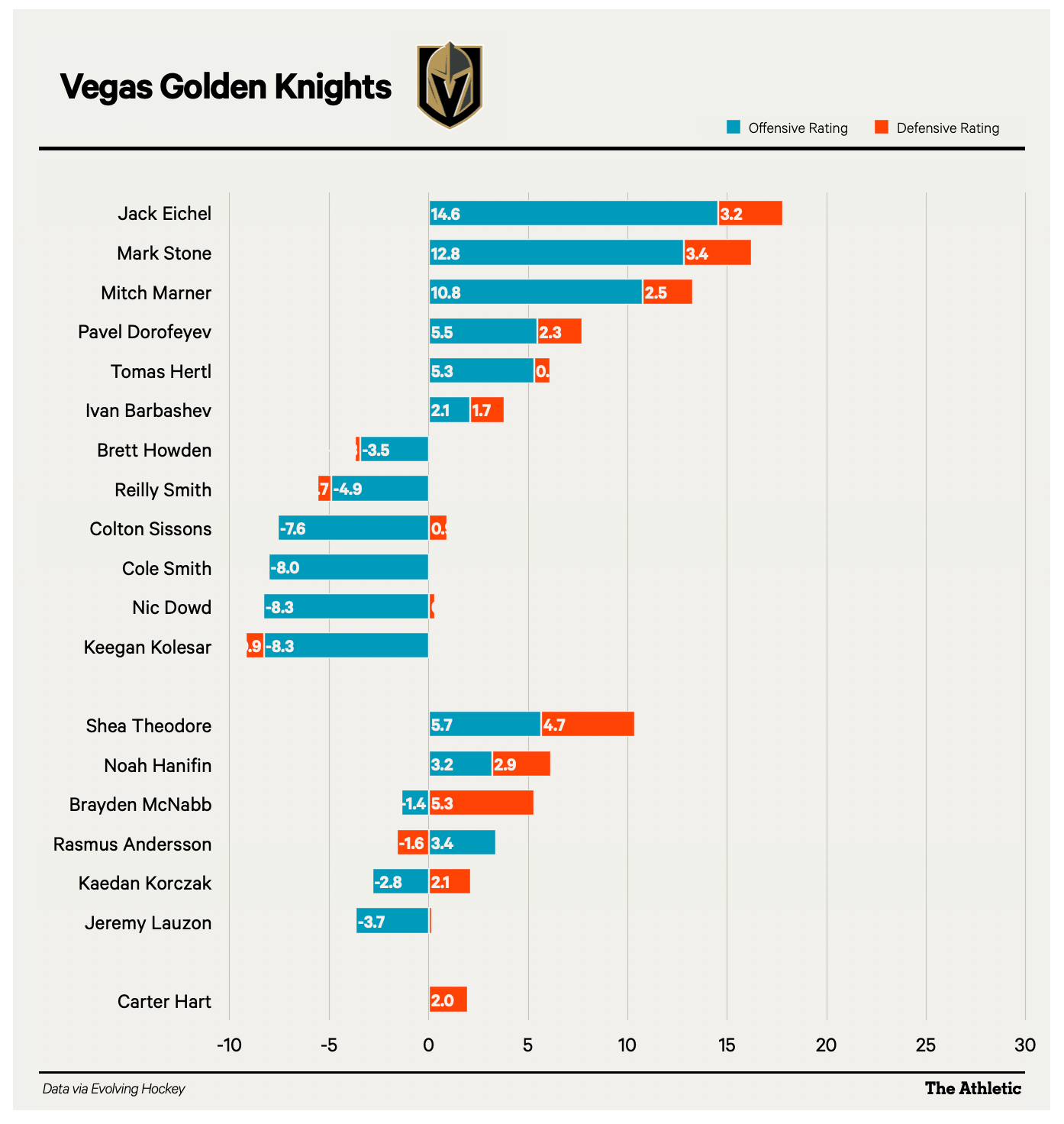 Where Marner has really added value, though, is on the other side of the puck. Long viewed as one of the best defensive forwards in the league despite playing on the wing, Marner put up a Defensive Rating of about 5.5, 10th among forwards overall and just a tick behind Eichel. With Marner on the ice against fairly tough competition, Vegas allowed about 2.0 goals per 60, the lowest number for any forward on the team outside of fourth-liners Nic Dowd and Cole Smith. Marner’s underlying numbers were fine, too, helping make his season a success — even if that success looked a bit different than anyone expected.