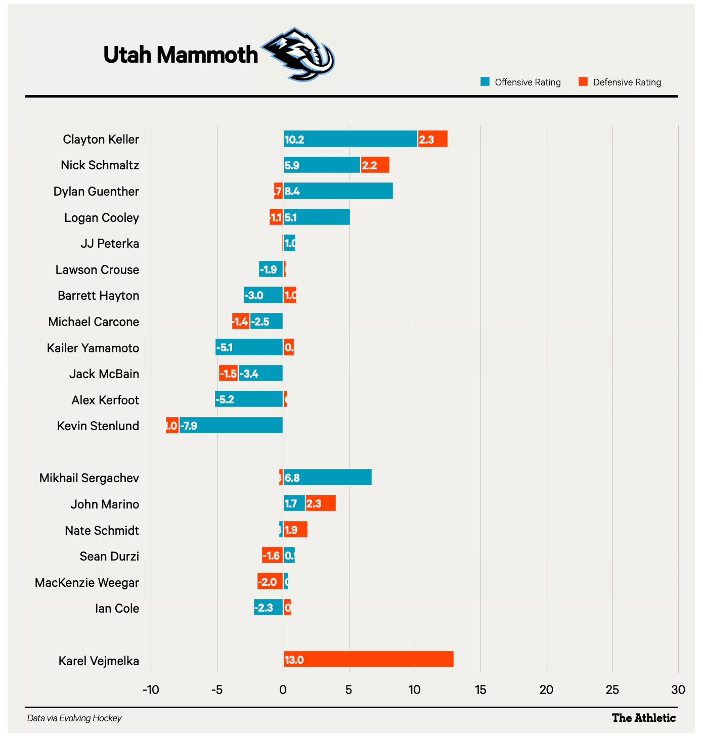 The loss of William Karlsson is really felt here and the combined damage is a minus-41 Net Rating. That’s tied with the Oilers for the worst among playoff teams and bottom-five in the league. That’s a real flaw for Vegas, and while Utah’s group is better, it’s only marginally so.
