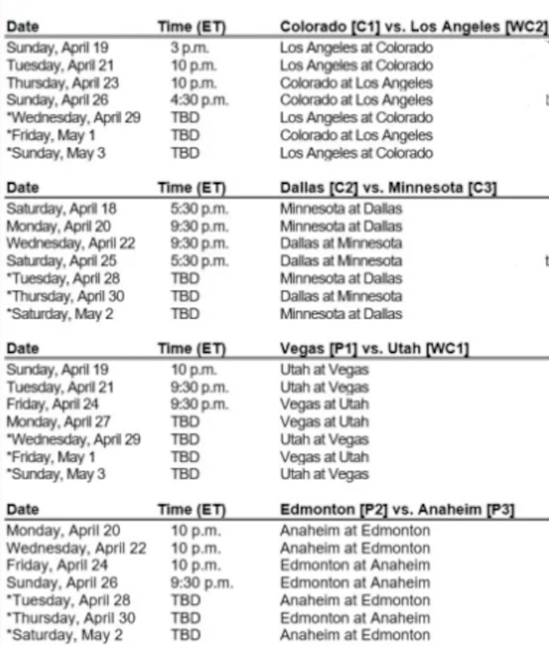 The Minnesota Wild and Dallas Stars will open playoff action in the Western Conference on Saturday, with the Los Angeles Kings facing the Colorado Avalanche and the Utah Mammoth taking on the Vegas Golden Knights in Game 1 of their first rounds series on Sunday.