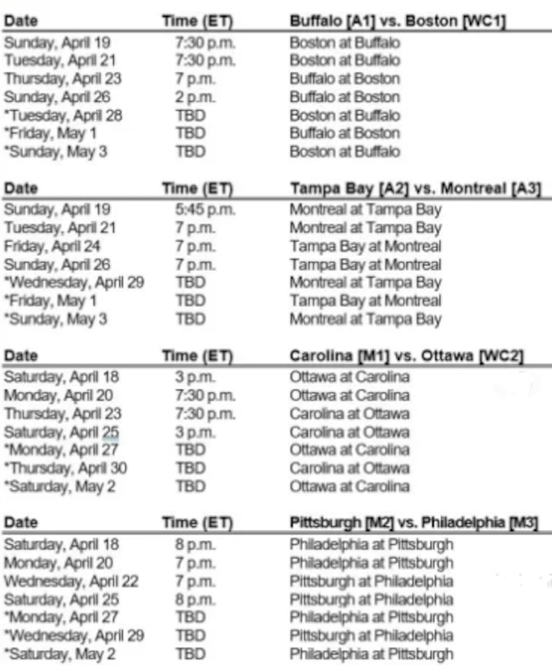 Elsewhere in the Eastern Conference, the Philadelphia Flyers will play Game 1 on the road against the Pittsburgh Penguins on Saturday, with the Boston Bruins opening their series against the Buffalo Sabres on Sunday.