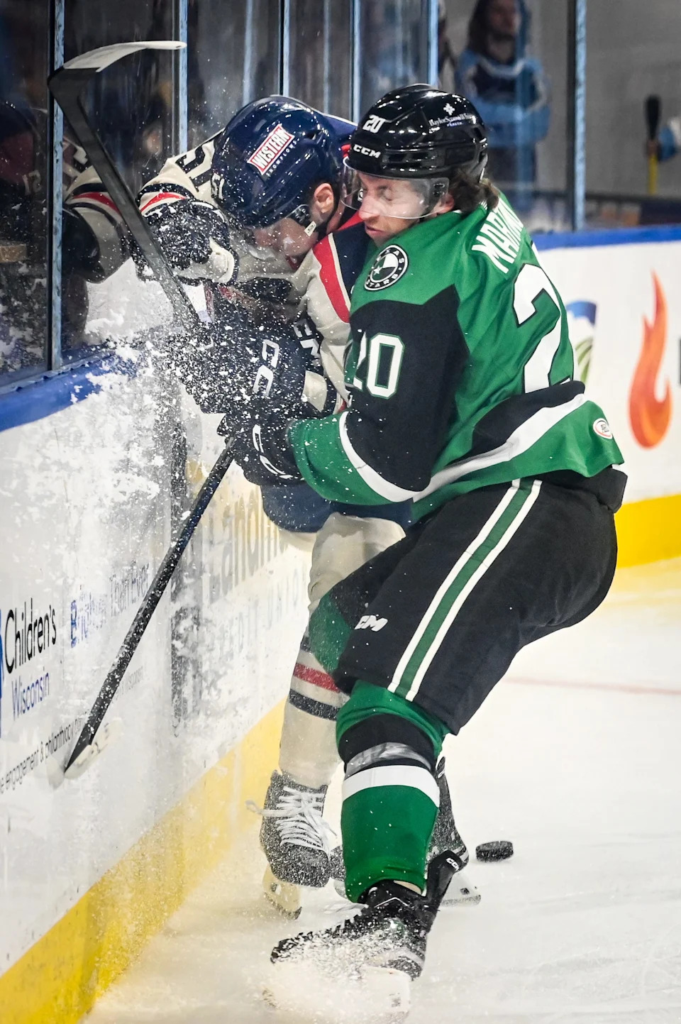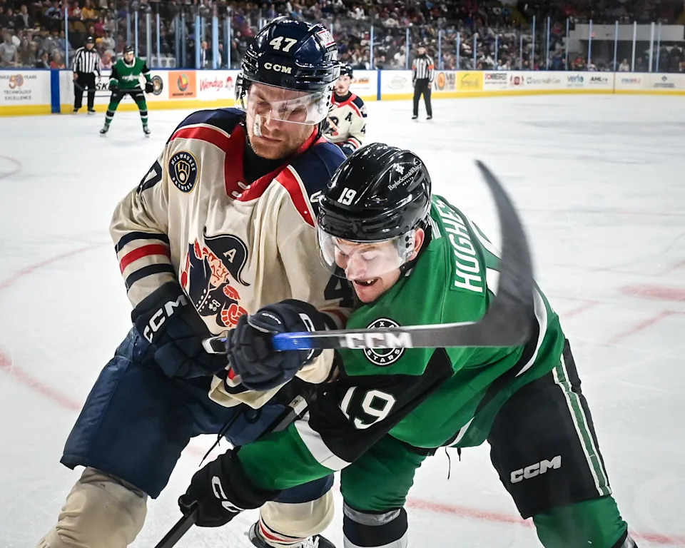 Dallas Stars forward Ayrton Martino crunches Milwaukee Admirals defenseman Jack Matier against the boards during a game Saturday, November 15, 2025, at UWM Panther Arena in Milwaukee, Wisconsin. (This caption was updated because an earlier version included an inaccuracy.)