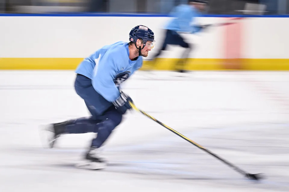 Milwaukee Admirals left wing Daniel Carr (43) streaks down the ice with the puck on the opening day of training camp Tuesday, September 30, 2025, at the UWM Panther Arena in Milwaukee, Wisconsin.
