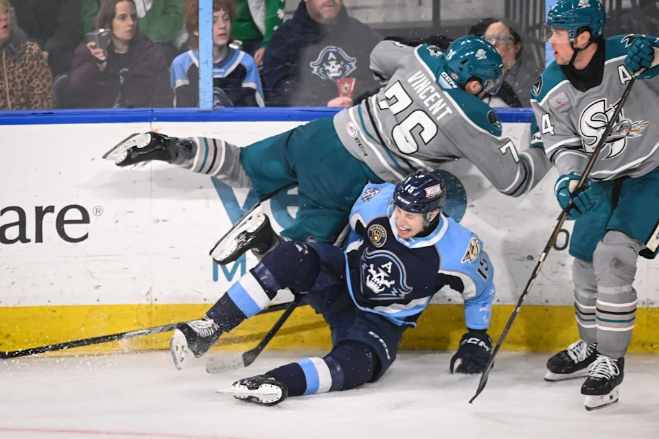 San Jose Barracuda forward Anthony Vincent (76) tumbles over Milwaukee Admirals left wing Isaac Ratcliffe (15) in the third period of a game Saturday, March 7, 2026, at the UWM Panther Arena in Milwaukee, Wisconsin. The. Barracuda won, 3-1.