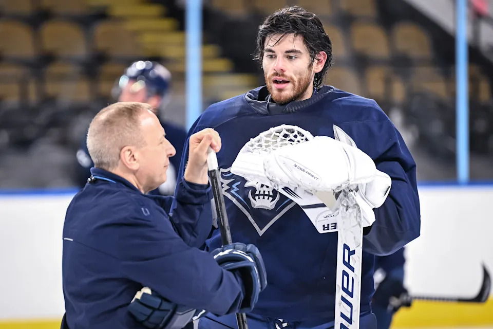 Nashville Predators goalie coach Mitch Korn talks with goaltender Ethan Haider (31) on the opening day of training camp Tuesday, September 30, 2025, at the UWM Panther Arena in Milwaukee, Wisconsin.