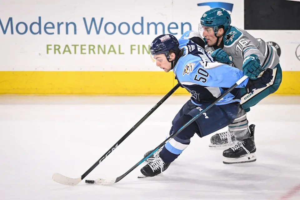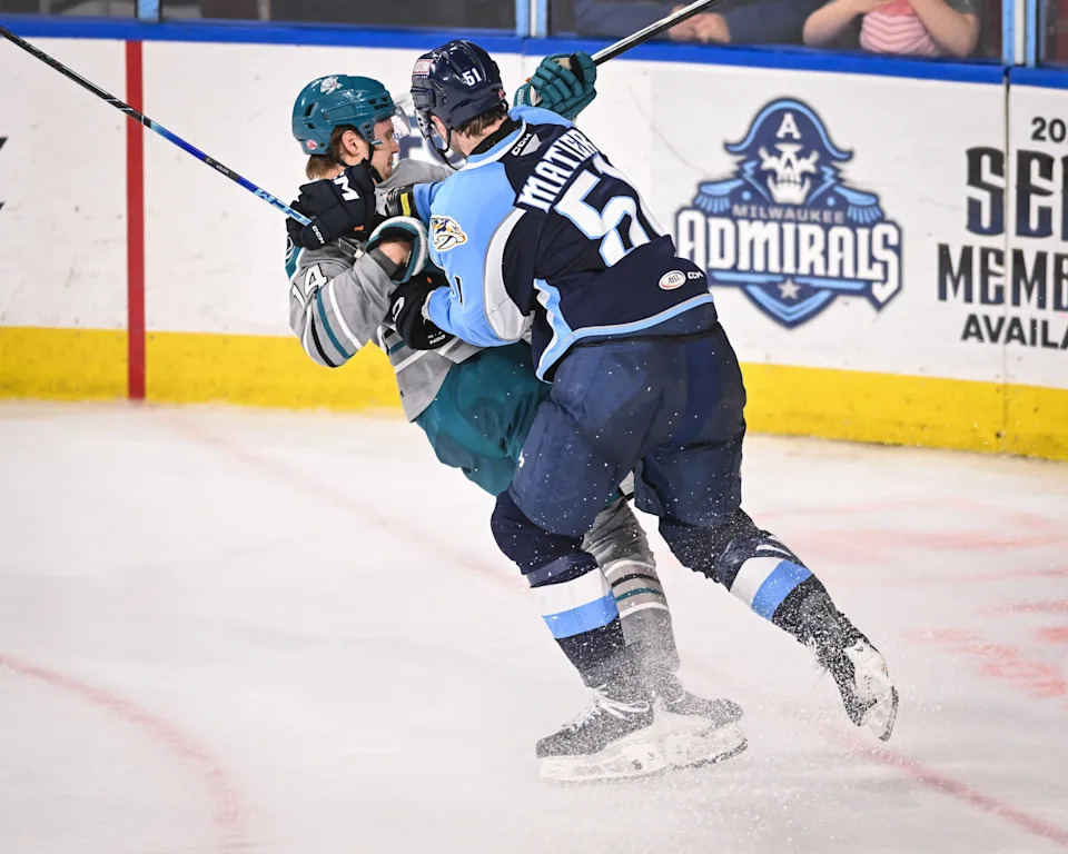 Milwaukee Admirals defenseman Jack Matier (51) levels San Jose Barracuda forward Kasper Halttunen (14) in the third period of a game Saturday, March 7, 2026, at the UWM Panther Arena in Milwaukee, Wisconsin. The. Barracuda won, 3-1.