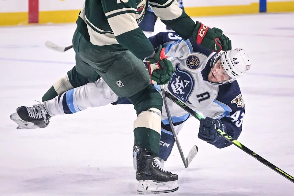 Milwaukee Admirals left wing Daniel Carr (43) is sent flying in a collision with Iowa Wild forward Bradley Marek (10) in the second period of a game Wednesday, December 3, 2025, at the UWM Panther Arena in Milwaukee, Wisconsin.