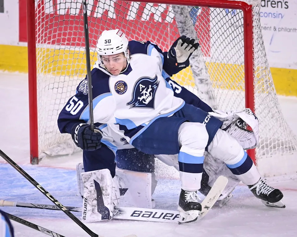 Milwaukee Admirals defenseman Tanner Molendyk (50) falls backward onto Milwaukee Admirals goaltender Matt Murray (32) as he tries to clear the puck against the Iowa Wild in the third period of a game Wednesday, December 3, 2025, at the UWM Panther Arena in Milwaukee, Wisconsin.