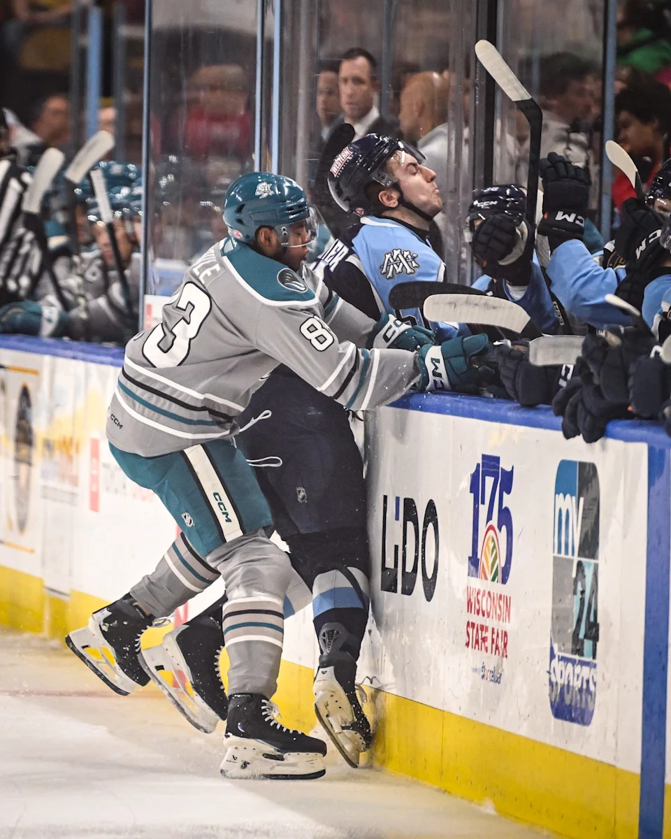 San Jose Barracuda forward Donavan Houle (83) slams Milwaukee Admirals defenseman Jack Matier (51) into the Admirals bench in the first period of a game Saturday, March 7, 2026, at the UWM Panther Arena in Milwaukee, Wisconsin.
