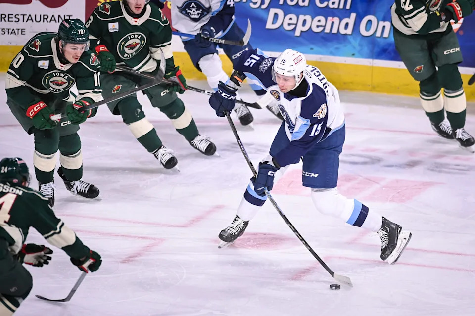 Milwaukee Admirals left wing Isaac Ratcliffe (15) shoots against the Iowa Wild in the third period of a game Wednesday, December 3, 2025, at the UWM Panther Arena in Milwaukee, Wisconsin.