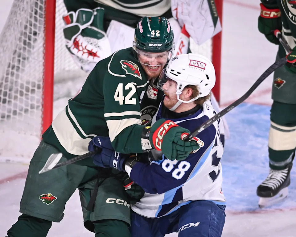 Milwaukee Admirals center Oasiz Wiesblatt (88) collides with Iowa Wild right wing Cameron Butler (42) in the third period of a game Wednesday, December 3, 2025, at the UWM Panther Arena in Milwaukee, Wisconsin.