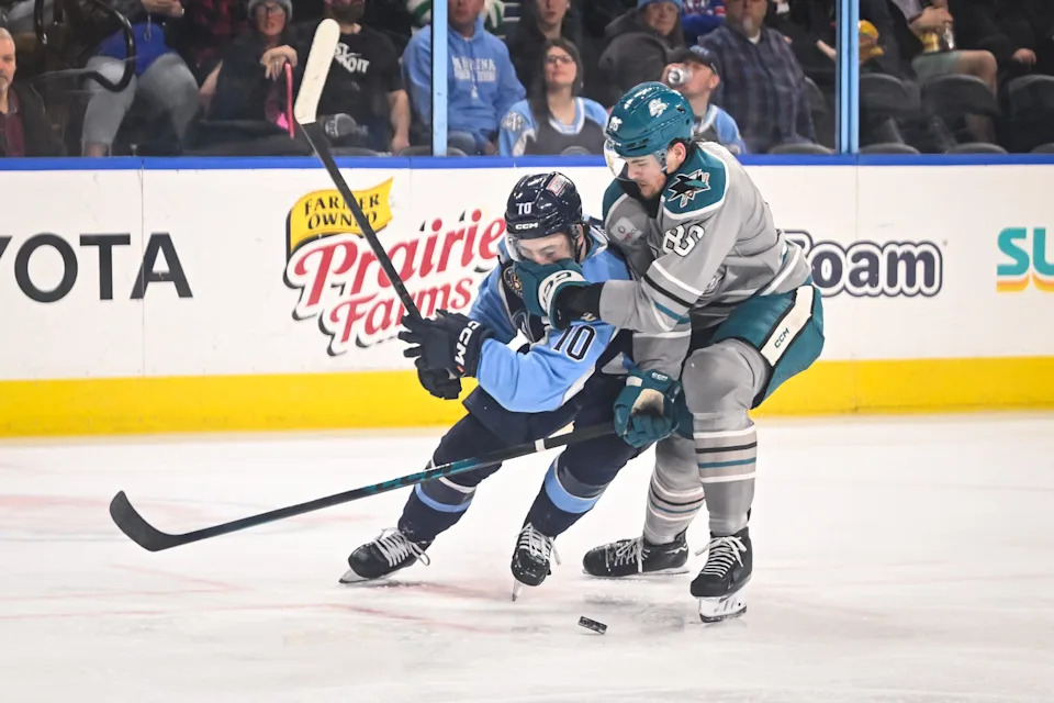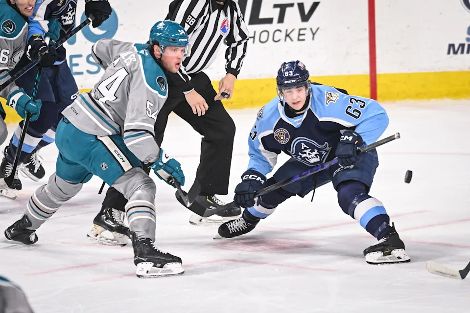 The puck hops away after a faceoff between Milwaukee Admirals center Austin Roest (63) and San Jose Barracuda forward Patrick Giles (54) in the first period of a game Saturday, March 7, 2026, at the UWM Panther Arena in Milwaukee, Wisconsin.