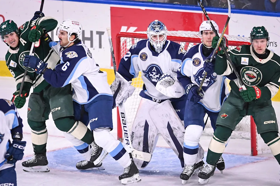 Milwaukee Admirals defenseman Andrew Gibson (6) leans on Iowa Wild right wing Jean-Luc Foudy (86) and Milwaukee Admirals defenseman Jordan Oesterle (82) on Iowa Wild forward Ryan Sandelin (13) to clear space in front of Milwaukee Admirals goaltender Matt Murray (32) in the third period of a game Wednesday, December 3, 2025, at the UWM Panther Arena in Milwaukee, Wisconsin.