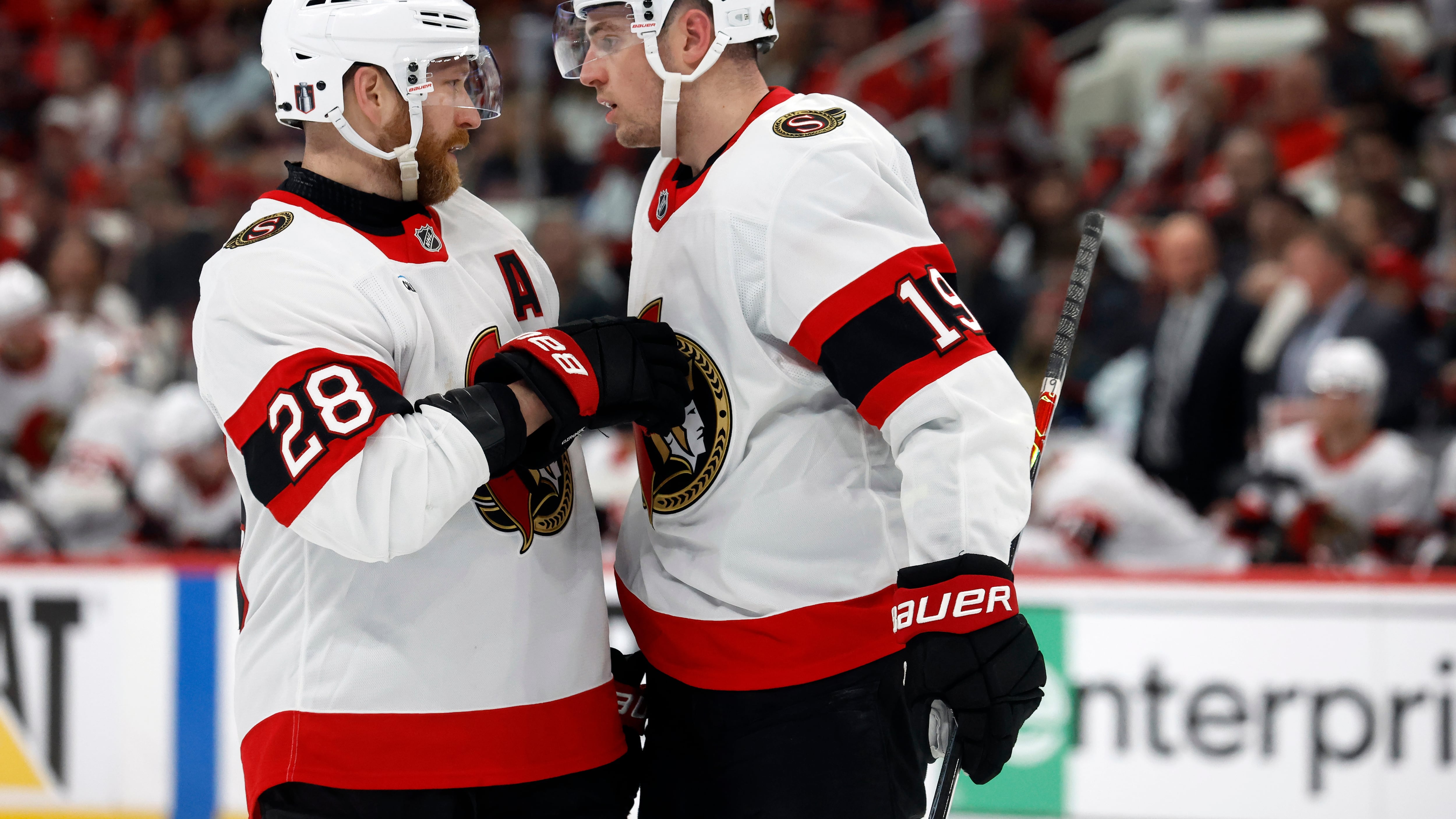 Ottawa Senators’ Claude Giroux (28) speaks with Ottawa Senators’ Drake Batherson (19) during the third period of an Game 1 of an NHL hockey Stanley Cup first-round playoff series against the Carolina Hurricanes in Raleigh, N.C., Saturday, April 18, 2026. (AP Photo/Karl DeBlaker)