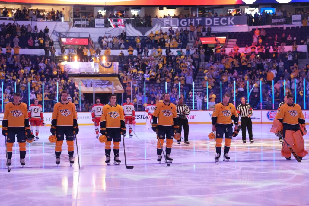 Nashville Predators players Brady Skjei, Nick Perbix, Cole O’Hara, Ryan O’Reilly, Steven Stamkos and Juuse Saros line up for the national nathem before their season finale on April 16, 2026 at Bridgestone Arena. JOHN RUSSELL/NASHVILLE PREDATORS