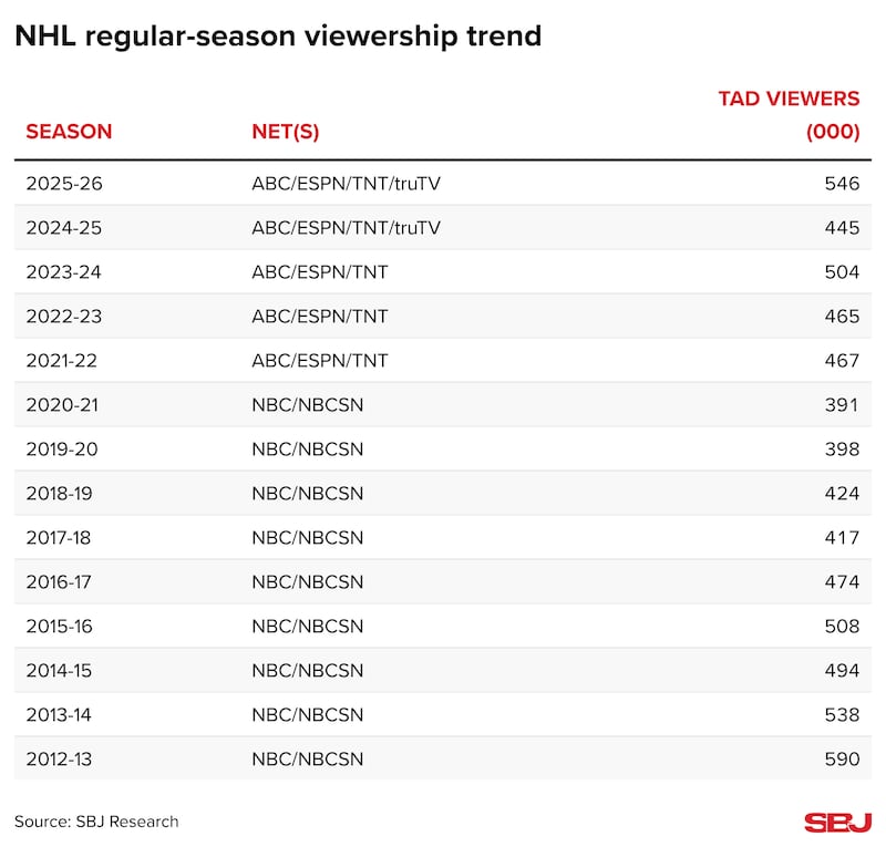 The NHL bounced back from lower viewership last season for its best regular-season average since the lockout-shortened 2012-13 season. All games across ESPN, ABC and TNT/truTV averaged 546,000 viewers, which is the best mark since NBC and NBCSN averaged 590,000 viewers over just 70 games 14 seasons ago.