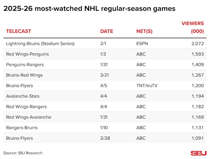 The Lightning-Bruins Stadium Series game on Feb. 1 on ESPN was the best NHL audience this season at 2.07 million viewers, which also was the best regular-season game ever on cable TV. ABC’s best game was Red Wings-Penguins on Jan. 3 (1.59 million).