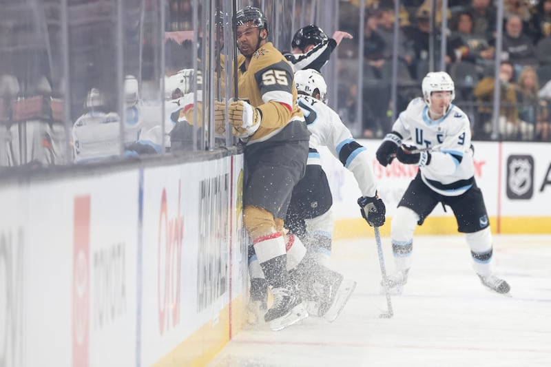 Vegas Golden Knights right wing Keegan Kolesar (55) crashes into the boards after failing to check Utah Mammoth center Logan Cooley (92) during the second period in Game 2 of a first-round NHL hockey Stanley Cup playoff series Tuesday, April 21, 2026, in Las Vegas. (AP Photo/Ian Maule) | AP