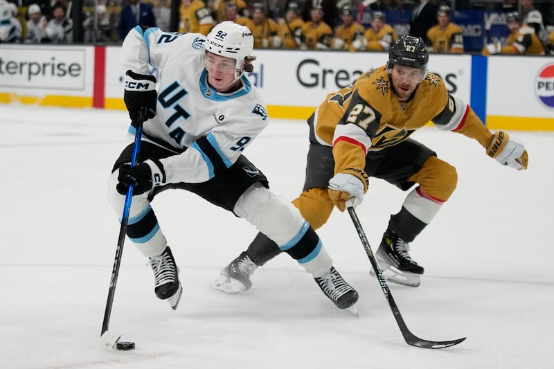 Utah Mammoth center Logan Cooley (92) skates against Vegas Golden Knights defenseman Shea Theodore (27) during the first period in Game 1 of a first-round NHL hockey Stanley Cup playoff series Sunday, April 19, 2026, in Las Vegas. (AP Photo/John Locher) | AP