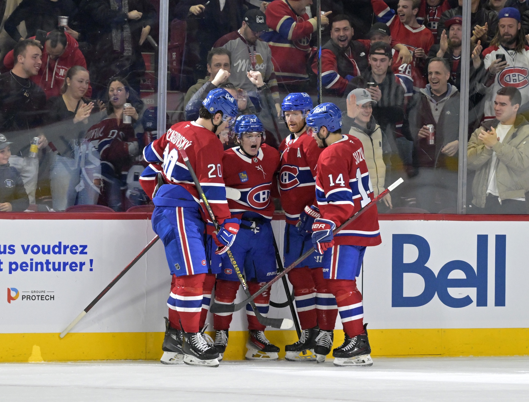 Apr 8, 2025; Montreal, Quebec, CAN; Montreal Canadiens forward Cole Caufield (13) celebrates with teammates after scoring a goal against the Detroit Red Wings during the second period at the Bell Centre. Mandatory Credit: Eric Bolte-Imagn Images