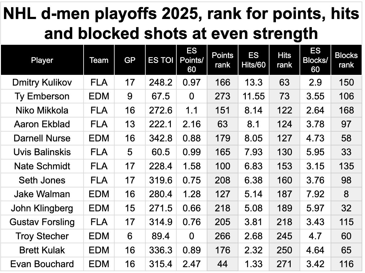 Vegas ranked 13th out of 16 playoff teams, 33 hits per 60. The Oilers rank sixth with 39 hits per 60.