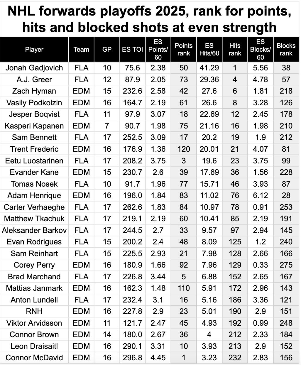 The Florida hit parade is led by a fourth-line hit machine of Jonah Gadjovich, 41 hits per 60, to lead all playoff performers, A.J Greer, 29 hits per 60 for fourth overall, and Jesper Boqvist, 23 hits per 60, 12th overall.