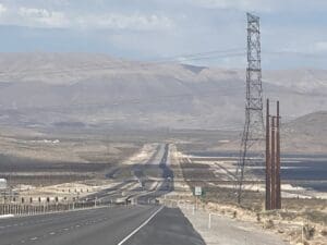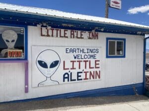 The scenery defies description as beautiful snowcapped mountains adorn one side of the highway. Desert mountains stand ominously on the other. I felt the rumble of being buzzed by fighter jets as I navigated the winding mountain roads at 2000 feet that led down into Rachel. I could only hear and feel the jets. Free-range cattle were wandering the desolate highways, but heat eventually won out, and–now that the statute of limitations has expired–I can admit that I made that Harley go as fast as it could in fear that I would pass out and die in the middle of the desert.