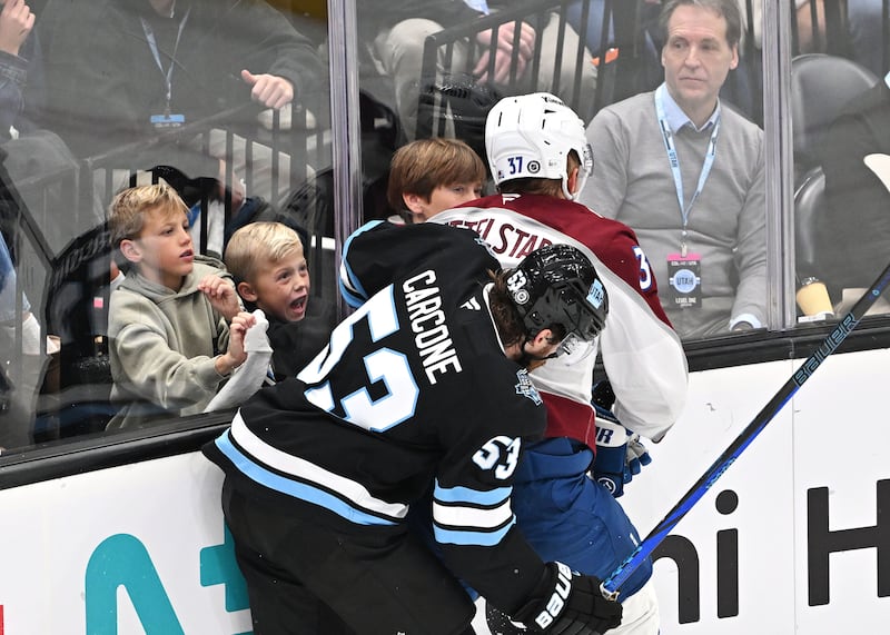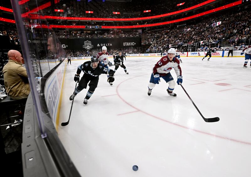 Utah Hockey Club left wing Michael Carcone (53) battles Colorado Avalanche center Casey Mittelstadt (37) for the puck as the Utah Hockey Club and Colorado Avalanche play at the Delta Center in Salt Lake City on Friday, Dec. 27, 2024. Colorado won 4-1. | Scott G Winterton, Deseret News Are there any quirks about the hockey fandom I should know going in?